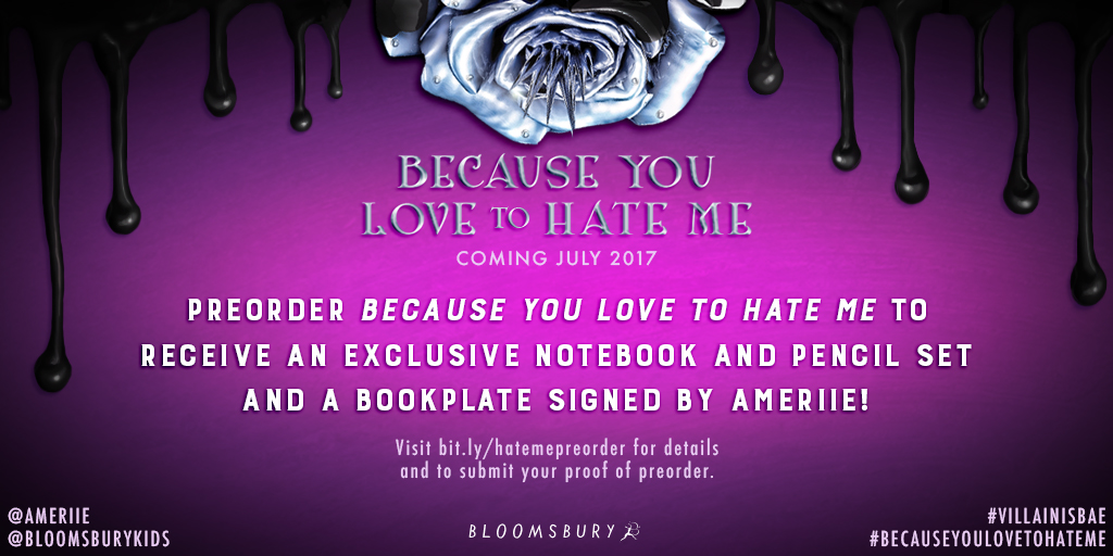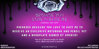 Guess what? If you pre-order Because You Love to Hate Me, a YA villain-themed anthology that pairs booktubers/bloggers with authors (cc: initial announcement, cover reveal, back cover and author pairing reveal), you will get a notebook and pencil set, and a bookplate signed by Ameriie.